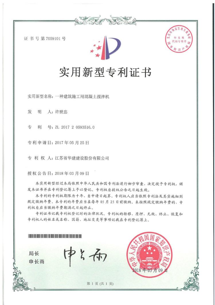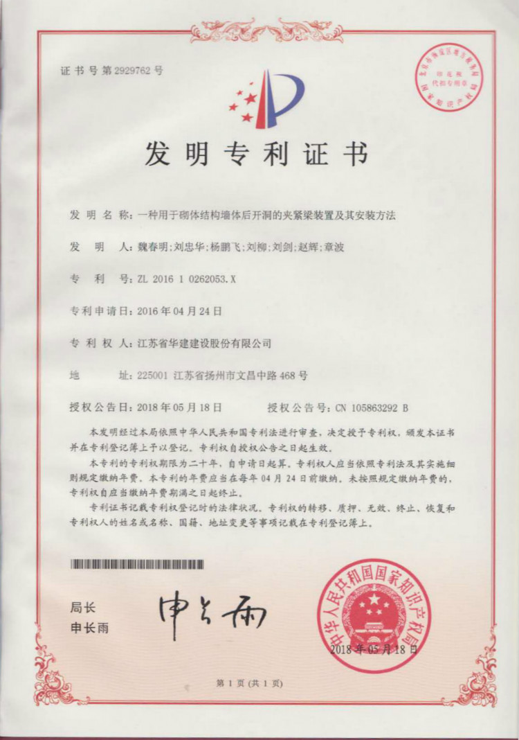 江蘇華建再獲1項發明專利、3項實用新型專利 時間:2018-06-06 3270 日前,從國家知識產權局傳來喜訊,江蘇華建上海區域公司發布的《一種用于砌體結構墻體后開洞的夾緊梁裝置及其施工方法》獲得發明專利授權(專利號:ZL201610262053.X),《一種建筑板材角磨機》(專利號:ZL201720592798.2 )、《一種建筑施工用鋼筋切斷機》(專利號:ZL201720593659.1 )、《一種建筑施工用混凝土攪拌機》(專利號:ZL201720593516.0 )獲得實用新型專利授權。