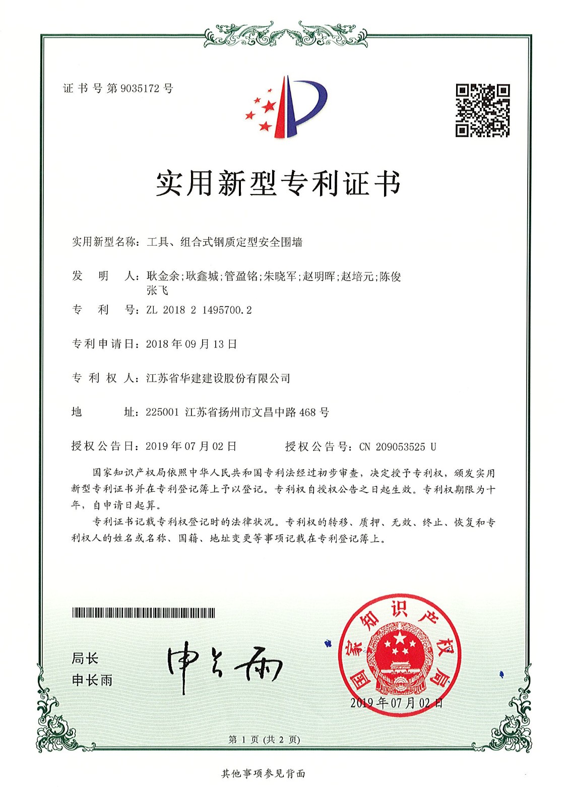 實(shí)用新型專(zhuān)利證書(shū)(工具、組合式鋼質(zhì)定型安全圍墻)