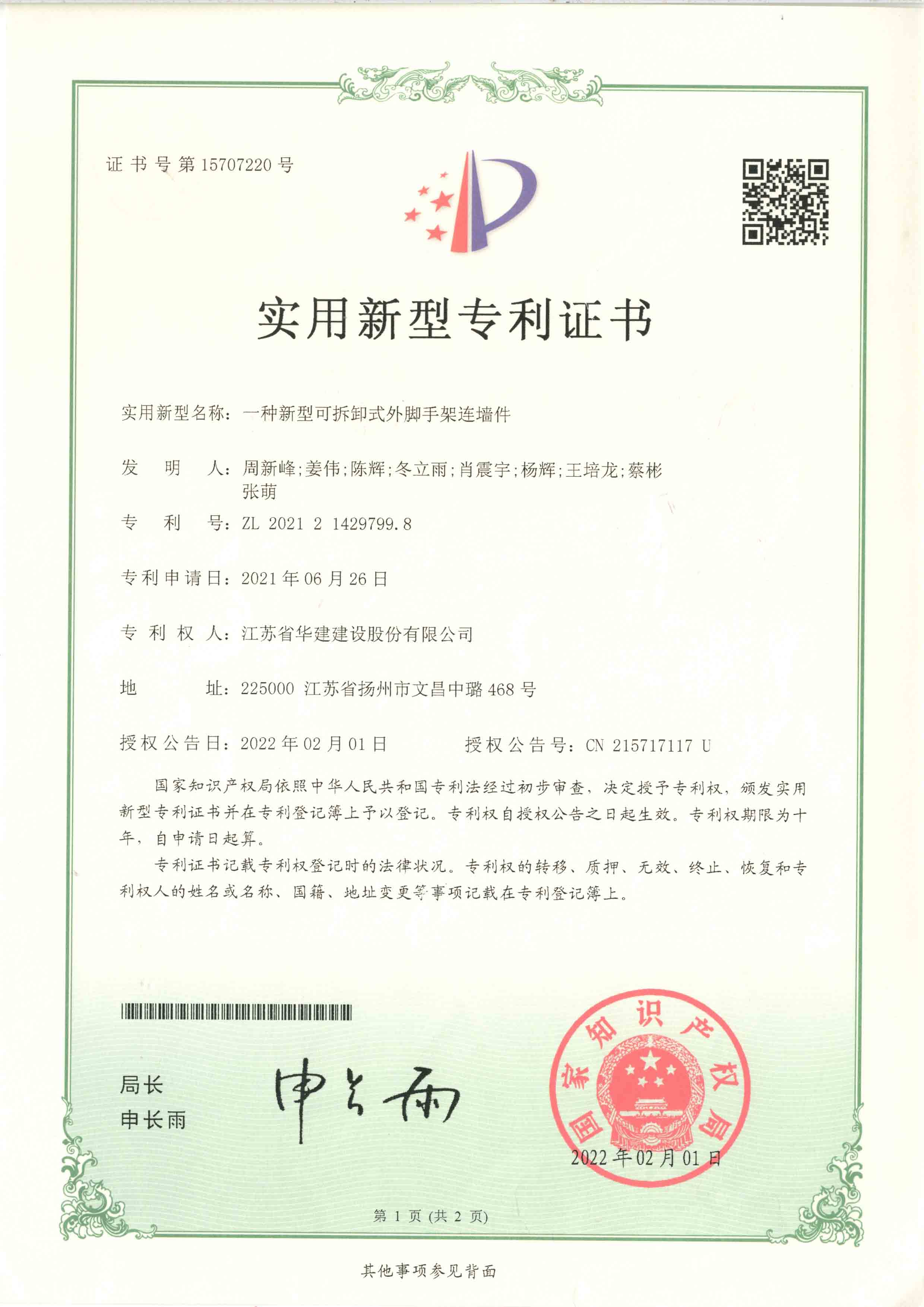 北京分公司2022年度已取得兩項實用新型專利證書 時間:2022-08-22 4032 日前,國家知識產(chǎn)權(quán)局頒發(fā)了實用新型專利證書,公司兩項專利取得實用新型專利證書,分別是:一種新型可拆卸式外腳手架連墻件、一種鋼筋混凝土現(xiàn)澆板板厚高精度控制裝置。