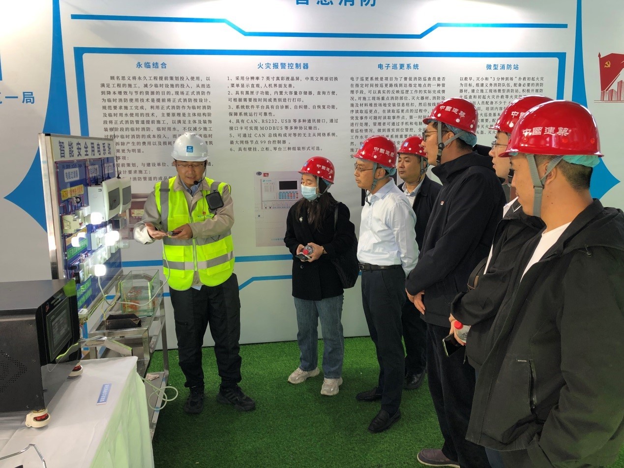 在中央芭蕾舞團業務用房擴建項目,大家認真觀摩了項目安全體驗區、智慧展廳、VR體驗館、暖心驛站、質量樣板區及觀摩展區,項目負責人介紹了大截面超厚板焊接、大跨度鋼桁架施工、屈曲約束支撐安裝、鋼管混凝土頂升工藝等施工重難點質量控制,智能數顯測厚度儀、智能數顯靠尺等智能檢查儀器,高大模板智能變形監測、動火作業管理系統等智慧樣板,特別是中建特色安全生產治理模式“六環安全管理”——“精細化個人防護”、“鋼結構施工立體化安全防護”、“智慧消防”、“本質安全用電”、“機械智能&雙十條安全管控”、“多模融合無線電定位應急救援”給大家留下深刻印象。 觀摩結束后,朱總指出該項目作為北京市安全質量及智慧管理標桿工地,值得學習和借鑒,要將此次學到的項目管理先進理念和經驗帶回去在自身項目上推廣運用,促進施工安全質量及智慧管理全面提升。