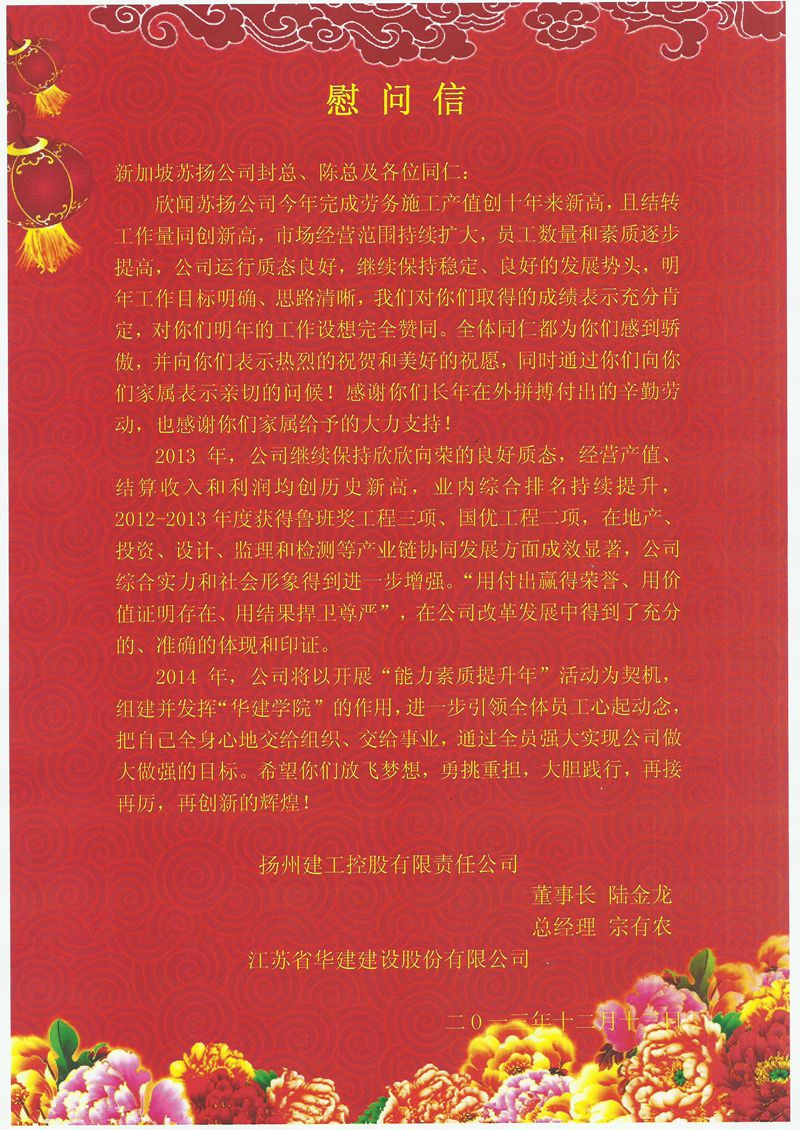 公司董事長、總經理發慰問信鼓勵新加坡蘇揚公司再接再厲 時間:2013-12-13 3526 12月中上旬,公司總部完成了對國內各區域公司的年終走訪調研。新加坡蘇揚公司則通過電子稿匯報了2013年工作情況及下年度工作思路。2013年新加坡蘇揚公司主要經濟指標創歷史新高;隊伍規模保持穩定;班組承包責任制成果顯著;市場份額持續擴大。總部認為這一年來蘇揚公司保質態,擴市場,穩增長,取得了不俗成績,公司董事長陸金龍、總經理宗有農特發慰問信鼓勵蘇揚公司再接再厲,再創新高!慰問信全文如下: