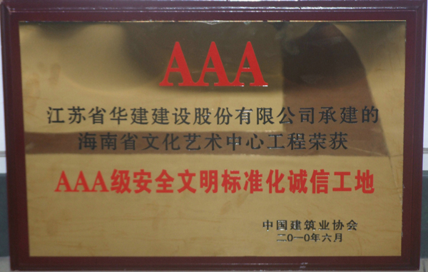 “海南省文化藝術中心”項目榮膺全國AAA級安全文明標準化誠信工地 時間:2010-07-24 5355 近日,經中國建筑業協會建筑安全分會在專家評審、組織抽查和網上公示,海南公司承建的海南省文化藝術中心工程榮膺全國“AAA級安全文明標準化誠信工地”,這是海南公司近年來首次獲得此項榮譽。 該項目自開工以來,以摘取魯班獎為最高質量目標,積極策劃,精心組織,以過程創精品,狠抓細部施工,各項指標始終處于受控狀態,多次接受省、市領導、專家、同行的現場觀摩,獲得業內高度評價。