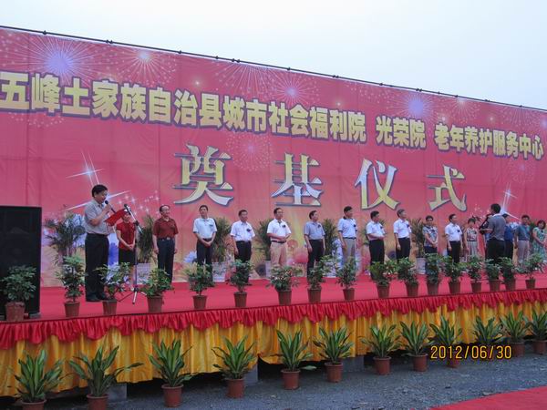 作為五峰新縣城遷建的首個重點項目,“五峰民政園”是一個集城市社會福利院、光榮院、老年養護服務中心、城市流浪人口救助站暨未成年人救助保護中心和兒童福利指導中心等設施于一體的高標準民政服務中心。儀式上,省民政廳副廳長趙顯富在致辭中強調本項目的重要性,要求各參建單位精心組織,科學施工,加快進度,保質保量完成任務;要按照“全國一流、全省領先”的工作要求,搶抓機遇,用足政策,真正把“五峰民政園”建成民心工程、德政工程、精品工程。