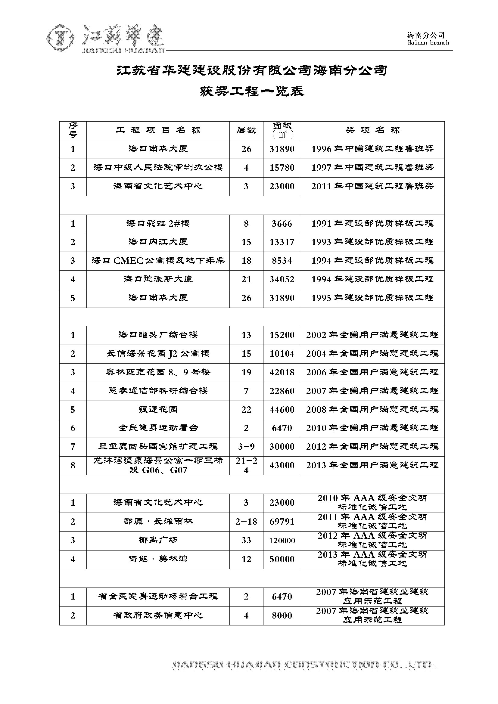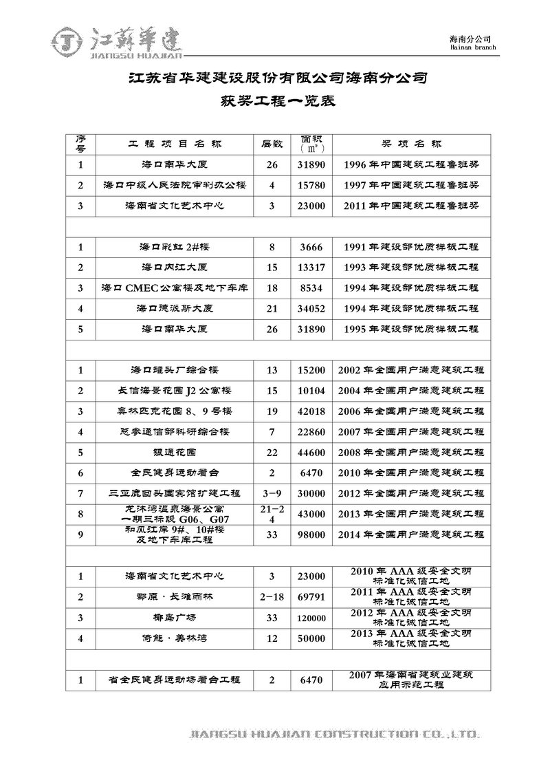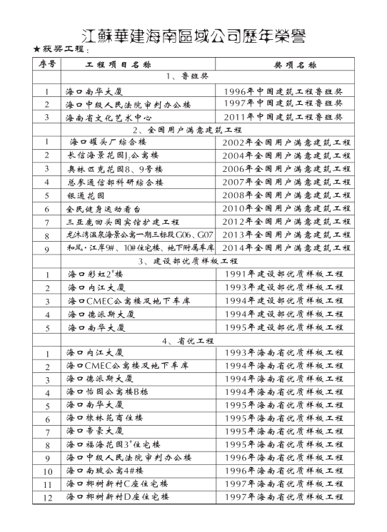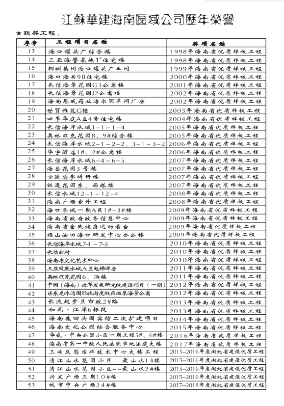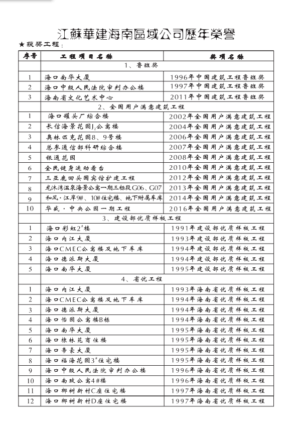 獲獎工程一覽 時間:2019-01-01 13548 魯班獎 全國用戶滿意建筑工程 全國AAA級安全文明標(biāo)準(zhǔn)化誠信工地 海南省優(yōu)質(zhì)樣板工程 湖北省建筑優(yōu)質(zhì)工程