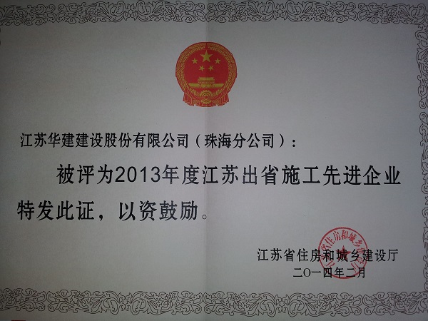 珠海公司獲江蘇省政府駐深圳辦事處和江蘇省住建廳聯合表彰 時間:2014-04-29 4876 日前,江蘇省人民政府駐深圳(廣州)辦事處和江蘇省住房和城鄉建設廳聯合表彰了一批2013年度江蘇進廣東、廣西、福建、海南施工先進企業和先進個人。江蘇華建珠海分公司被表彰為2013年度江蘇出省施工先進企業,珠海公司副總經理周學軍被表彰為2013年度江蘇出省施工優秀企業經理,曹亞明同志被表彰為優秀建造師。 此外,珠海公司副總經理盧達被江蘇省住房和城鄉建設廳駐南方辦事處表彰為2013年度江蘇省進廣東施工質量安全管理先進個人,李成祥同志被表彰為經營財務管理先進個人。
