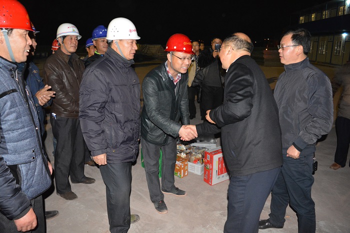 夜幕降臨,新區施工片區燈火通明,機械運轉聲此起彼伏。據統計,當晚項目共計約250人,各類機械設備140多臺參與加班作業,整個片區儼然一派熱火朝天的景象。晚9時許,廣安區委書記文建平率廣安區四套班子有關人員分別來到方坪大道、盛世芳庭、官盛春天以及蓮花大道等施工現場,給正在加班加點施工作業的全體員工送來面包等食品和飲料,對他們不懼嚴寒堅持作業的辛勤付出表示衷心感謝和慰問。他強調,新區美好家園安置房標準高,百姓給予了很大期待。華建作為施工單位,搶晴天,占雨天,不分白天黑夜堅持作業,為本地百姓干了實事,做出了貢獻。他同時指出,新區項目管理規范,員工統籌到位,各級領導參觀后多有贊揚,“是實實在在的標準化工地”。文書記最后勉勵大家,新區項目建設進展快,質量好,百姓也滿意,希望項目上下再加油,保質量保安全保進度,共同建設好官盛新區項目。