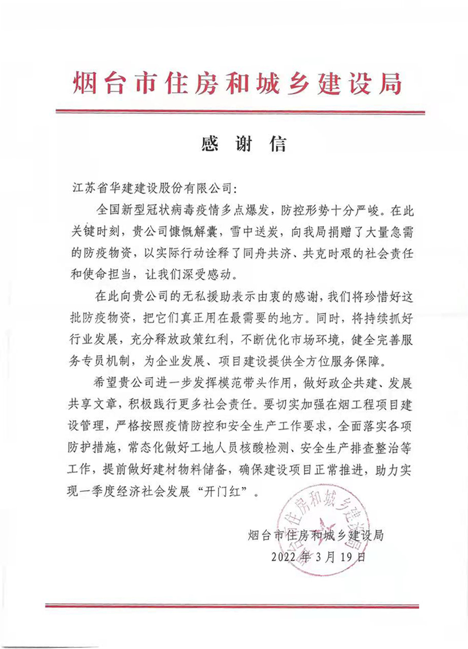 3月19日,公司收到煙臺(tái)市住建局發(fā)來(lái)的感謝信,信中對(duì)公司大力支持疫情防控,捐贈(zèng)防控物資表示...